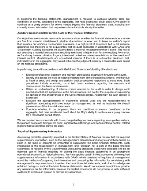 an opinion on the effectiveness of the City’s internal control. Accordingly, no such opinion is