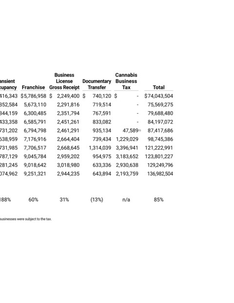 (1) In Fiscal Year 2018-19 the voters approved the Cannabis Business Tax. Fiscal Year 2019-20 was the first year any businesses were subject to the tax.