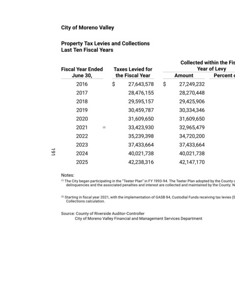 (1) The City began participating in the “Teeter Plan” in FY 1993-94. The Teeter Plan adopted by the County of Riverside guarantees each participating city payment equal to 100% of the total tax value. Any