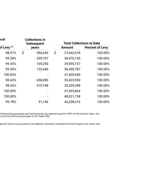 (1) The City began participating in the “Teeter Plan” in FY 1993-94. The Teeter Plan adopted by the County of Riverside guarantees each participating city payment equal to 100% of the total tax value. Any