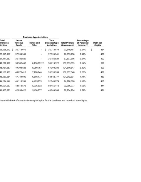 Fiscal Year of Revenue Notes and Lease Governmental Revenue Notes and Businesstype Total Primary of Personal Debt per