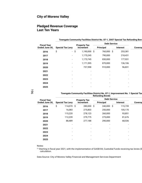 (1) Starting in fiscal year 2021, with the implementation of GASB 84, Custodial Funds receiving tax levies (Special Tax) are accounted for as liabilities, therefore, excluded from the Pledged Revenue Coverage