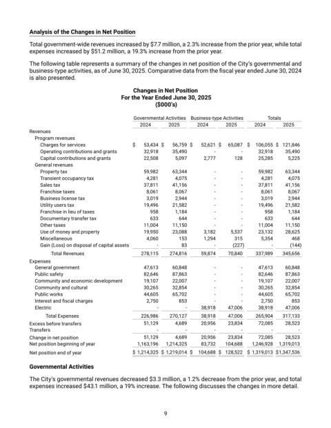 The following table represents a summary of the changes in net position of the City’s governmental and